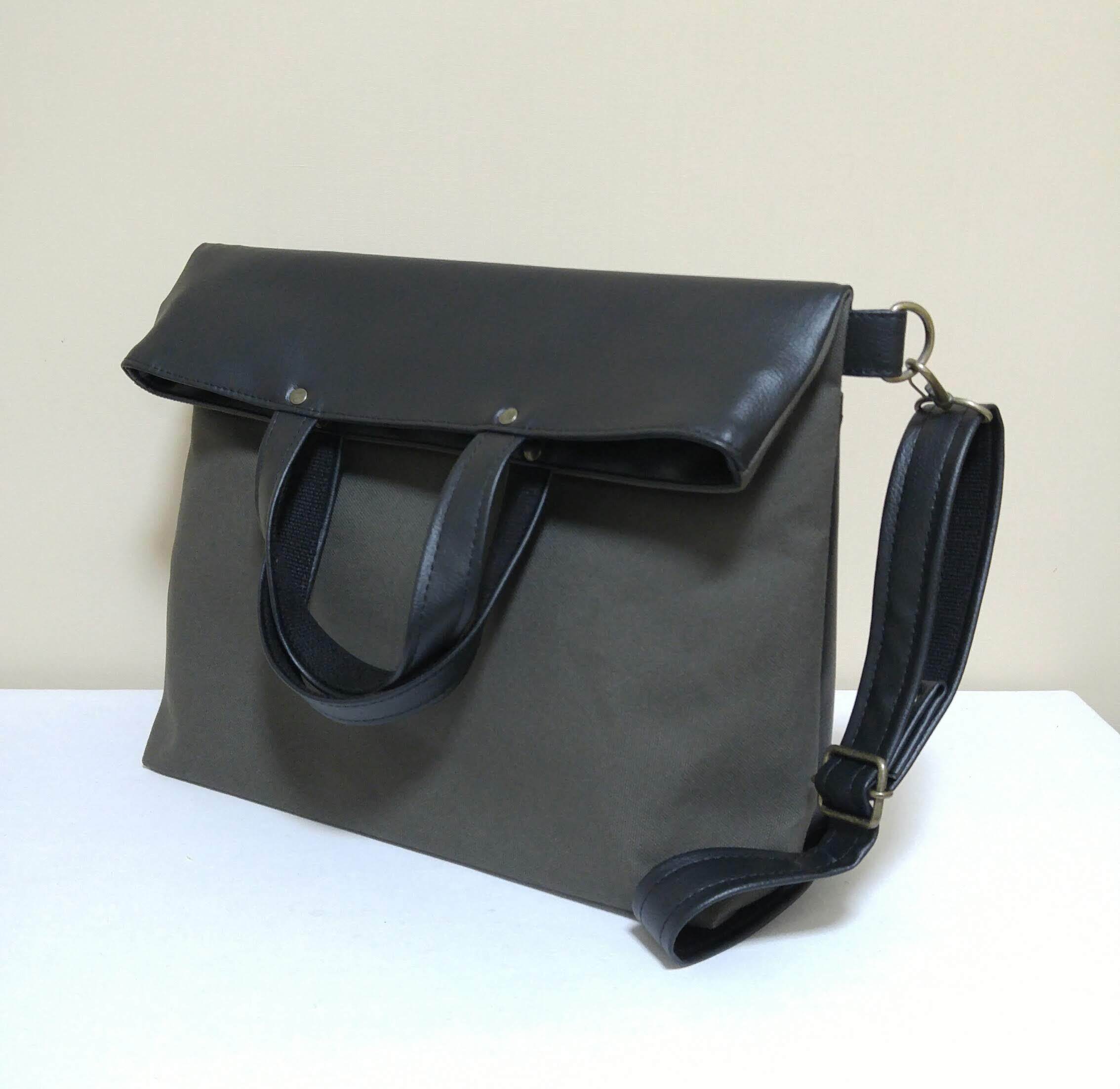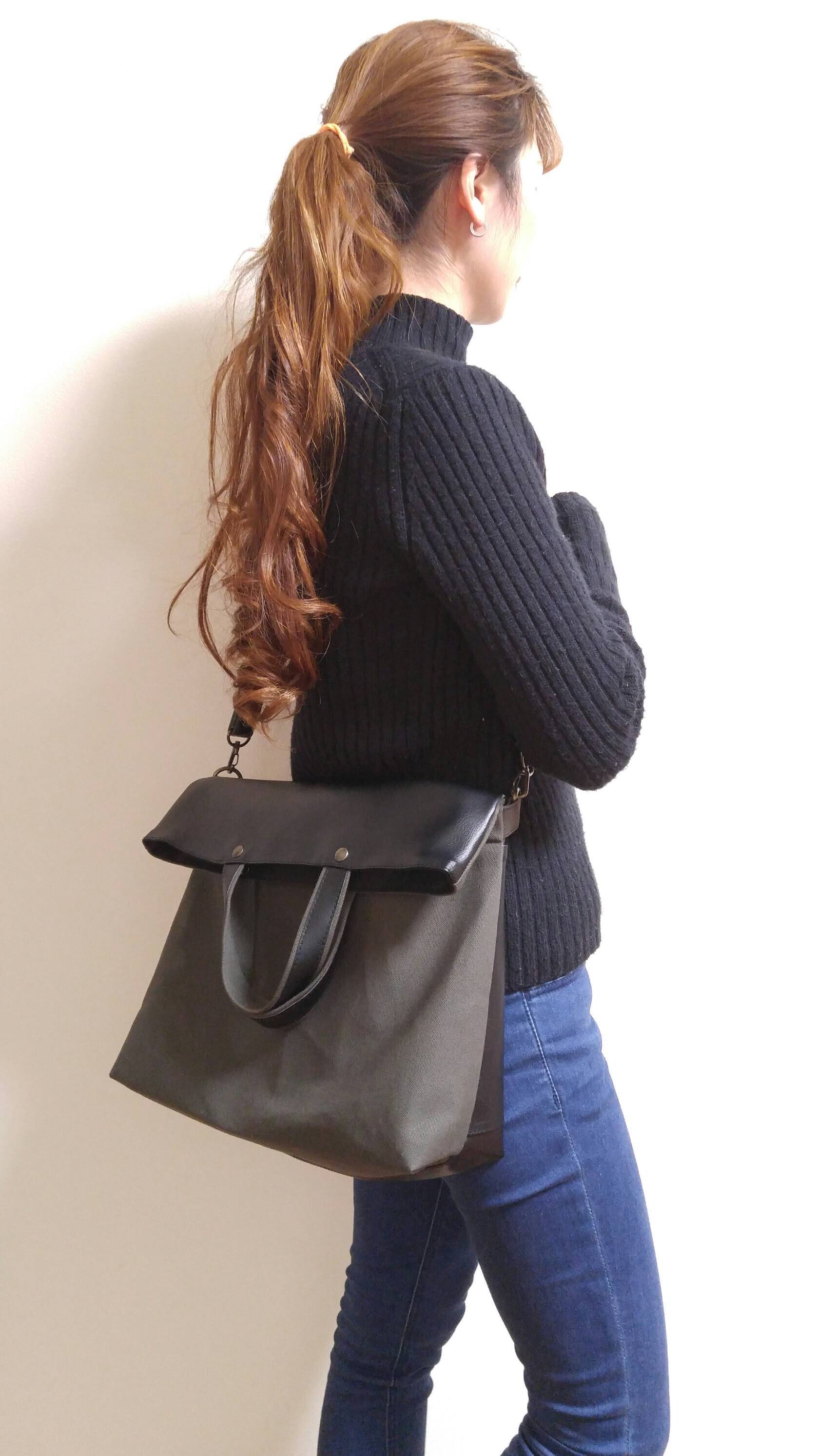 ブラックレザー(pvc)×オールドカーキ帆布2wayショルダー(通勤通学A4対応)